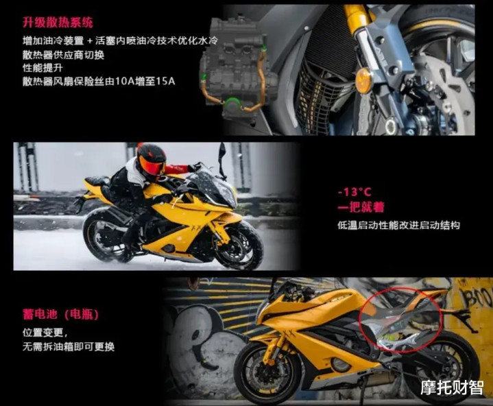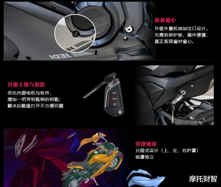 维保简略性大幅擢升,外置机油加注口缱绻无需拆卸护板,电瓶位置变更后无需拆油箱即可更换,分段式油箱护罩、孤独锁罩,让正常维保省时幽闲。此外,电锁模块升级、车把锻钢加固、鞍座优化钝化、喇叭位置更始等细节,兼顾安全性与舒坦性;牙盘链条升级、要道螺栓加布防松步调,进一步擢升整车可靠性。