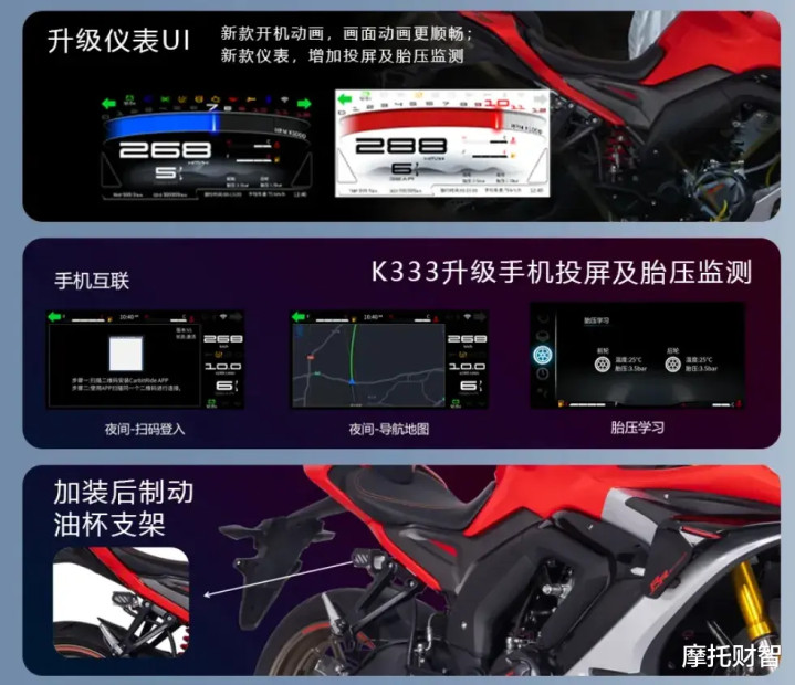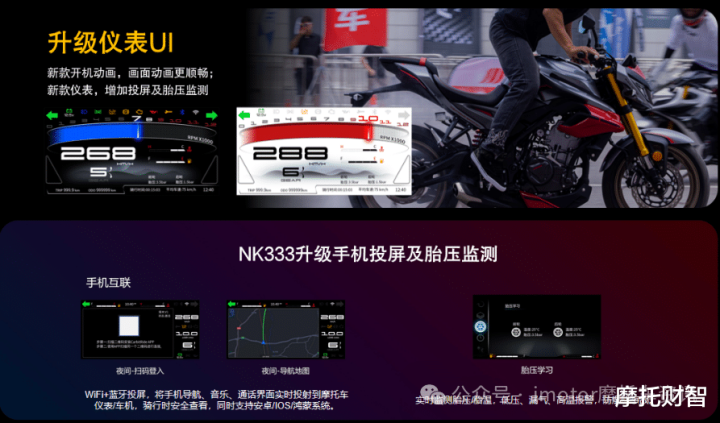 NK333是K333的街车版块,前年九月高涨,获取好多街车提神者心爱,如今26款如约升级而来。最初是优化UI界面,新增手机投屏与胎压监测功能,升级加装后刹车油杯护罩。