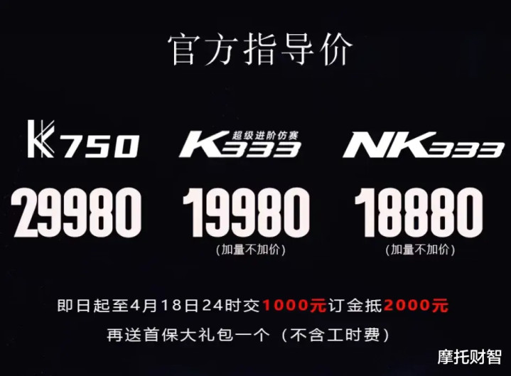 旗舰仿赛杰迪K750 售价:29980元,初学仿赛K333 售价:19980元,街车新贵NK333 售价:18880元。另有限时1000顶2000,外加首保大礼包。