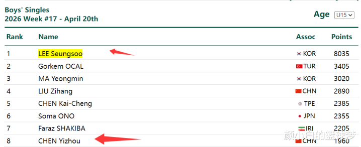 李承洙更是U15男单全国排行第一的选手,而陈逸舟通过前两站的奋发他的U15男单全国排行才升至第八,但两东谈主之间的积分差距无比之大,李承洙积分高达8035分,而陈逸舟积分惟有1960分,两东谈主积分差距6075分,陈逸舟在这个赛季很难跨越李承洙,但陈逸舟在本站是横扫李承洙,这即是禀赋使然。