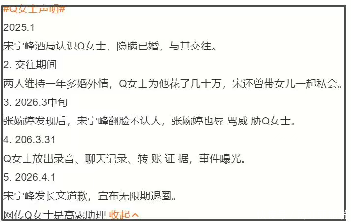 没思到宋宁峰承认出轨并谈歉后,这件事情还没已毕。 4月3日,Q女士一刹发布长文,附上灌音和聊天截图,她说我方不是局外人,而是被宋宁峰追求了一年多,两东谈主融会于2025年大除夕酒局! 一初始宋宁峰对她抓手抓脚,她斥逐了对方,其后宋宁峰宣称已与张婉婷条约分辨,两东谈主才迟缓走近,她为此销耗了几十万,恶果事发后宋宁峰不吭声,张婉婷反而找上门来,恫吓要公开她的奥秘像片,还干涉她的家东谈主。 全球发现Q女士不是无为网友,而是演员高露的助理,她随着高露责任好几年,账号里发过好多路透像片,张婉婷恫吓时提到把像片发给高露,这显著是思用圈子里的东谈主脉来压她, Q女士本年25岁,光棍,长得娟秀,不像网上说的那种贪心财帛的东谈主,她此次出来谈话,更像是被甩锅之后真是忍不下去了。 重要点在于条约分辨这四个字,快乐飞艇下载Q女士晒出张婉婷我方的聊天纪录快乐飞艇,内部张婉婷亲口说大年三十没在沿途是因为照旧离了,但法律上没办手续就不算分辨,宋宁峰一边跟Q女士处着对象,一边还在应答平台晒恩爱像片、接告白相助、直播卖货赢利,这些行径反覆无常太大。 刻下网友们见地不同,有东谈主以为Q女士明明知谈对方有家室还要接续搏斗,算不上无辜,也有东谈主责怪张婉婷,丈夫出轨不找丈夫表面,反而去敲诈另一个女东谈主,还用奥秘像片恫吓东谈主家,这哪是受害者该作念的事,根底即是在玷污东谈主,宋宁峰重新到尾没出头,谈个歉就消散不见,确乎最释怀。 Q女士在文娱圈作念助理责任,地位跟宋宁峰没法比,她敢站出来谈话,是因为手上字据皆全,可账号没多久就被封了,这类事畴昔也发生过,女方时时被贴上多样标签,男方谈个歉就能退圈保全我方,她刻下还说有新灌音要公开,不外还没东谈主确厚爱假,孩子一直没启齿,也没东谈主去问过他的思法。