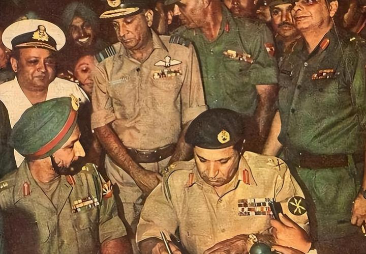 1971年12月16日,达卡的竞走场,尼亚都中将,东巴巴基斯坦戎行司令,走上台前,在降服书上签下了我方的名字。