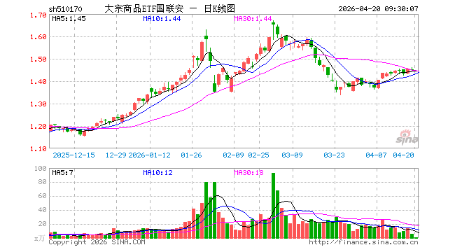 4月20日,巨额商品ETF国联安(510170)开盘跌0.28%,报1.446元。巨额商品ETF国联安(510170)重仓股方面,江西铜业开盘涨0.53%,恒力石化涨0.90%,白银有色涨0.12%,厦门钨业跌0.94%,华鲁恒升跌0.11%,紫金矿业涨0.37%,快乐飞艇中国巨石跌1.25%,金钼股份涨0.00%,南山铝业跌0.31%,山东黄金涨0.03%。