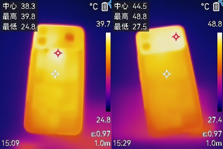 热成像图 · REDMI K90 MAX开启/关闭电扇的温度对比图