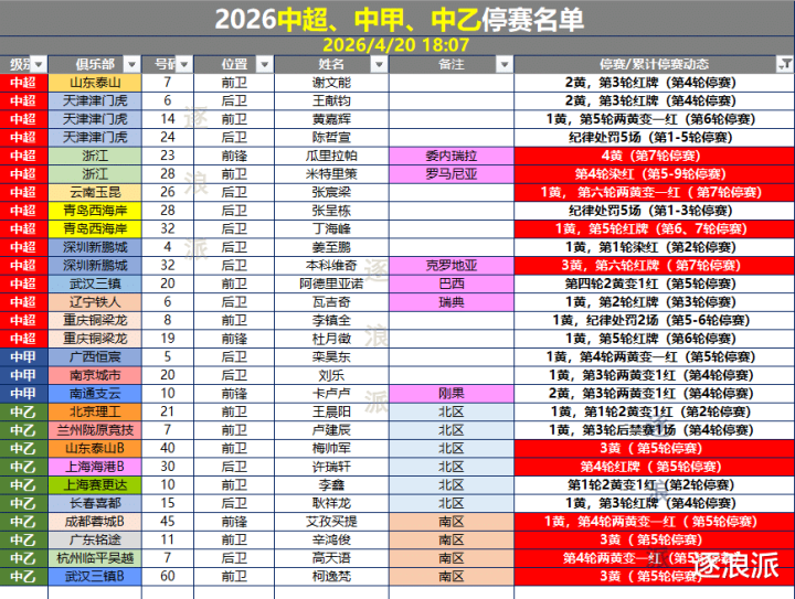中超第7轮、中甲第6轮、中乙第5轮在本月21-26号的比赛赓续开启,时辰中超5东谈主停赛,中甲全员可登场,中乙6东谈主停赛。